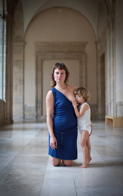 “Maternidad y lactancia han estado presentes en manifestaciones tanto del arte prehistórico y clásico como en otras pertenecientes a la actualidad. La visión que la fotógrafa Isa Sanz nos propone en Alma Máter aparece enriquecida bajo un prisma ideológico, cuasi filosófico. Alma máter significa madre nutricia, madres que alimentan, en el sentido más amplio del término» Verónica Serrada, escritora, madre y protagonista de una de las obras junto a su hijo Coen.