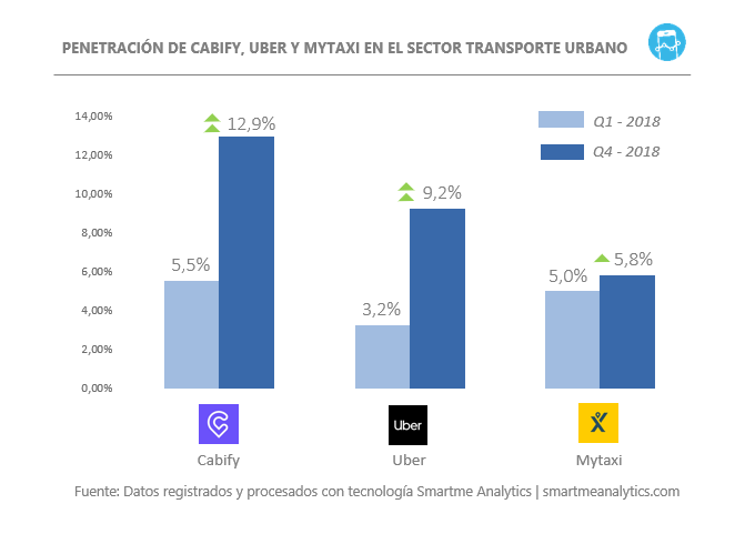 En el primer trimestre de 2018, Cabify, Uber y mytaxi tenían una penetración en su sector del 5,5 %, el 3,2 % y el 5% respectivamente, mientras que en el último trimestre de 2018 han llegado al 12,9 %, 9,2 % y 5,8 % respectivamente.