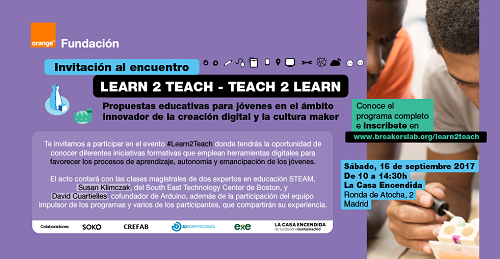 La Fundación Orange organiza ‘Learn 2 Teach – Teach 2 Learn’, una jornada que investiga propuestas educativas para jóvenes en el ámbito innovador de la creación digital y la cultura maker. ¿Cuando? El 16 de septiembre en La Casa Encendida, Madrid, con entrada libre, previa inscripción. Participarán Susan Klimçzak, del South East Technology Center de Boston, y David Cuartielles, cofundador de Arduino.
